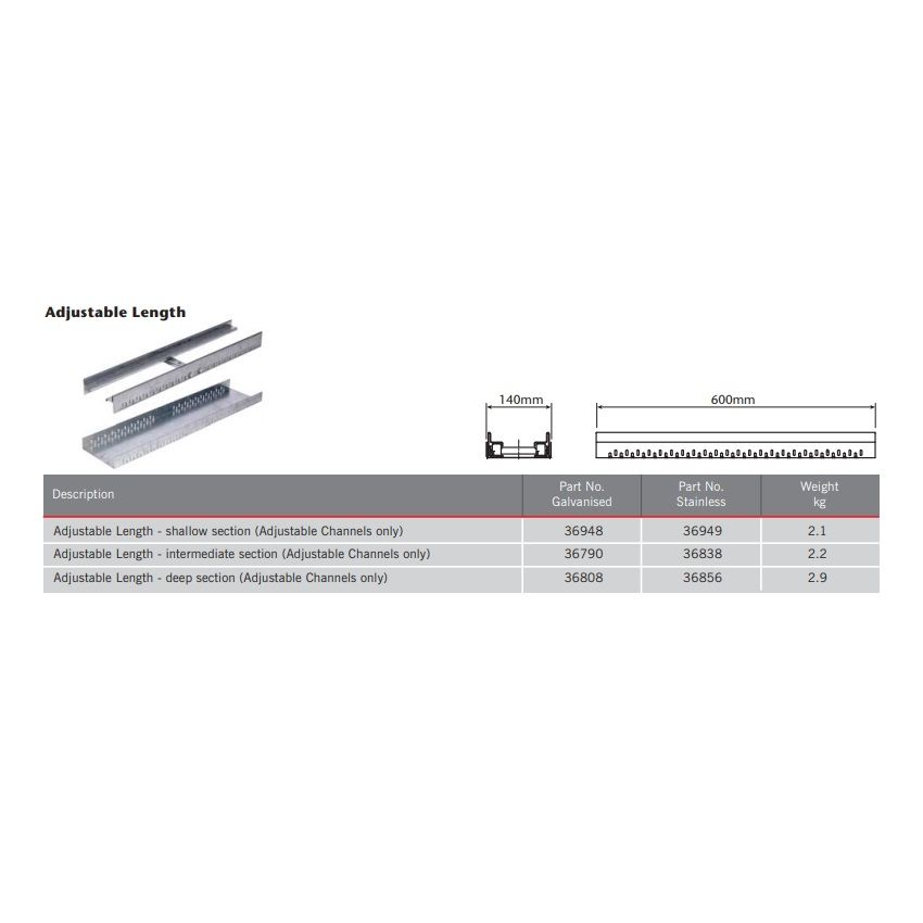 ACO FreeDeck Channel Adjustable length, 600mm long, manufactured in Galvanised Mild Steel or Stainless Steel (Grate sold separately).