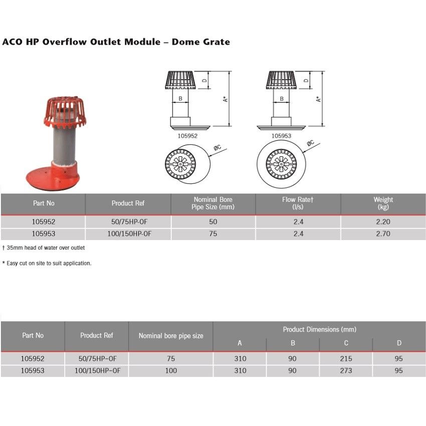 ACO HP Overflow Aluminium Roof Outlet, available with a Dome grate in sizes 75mm & 100mm.