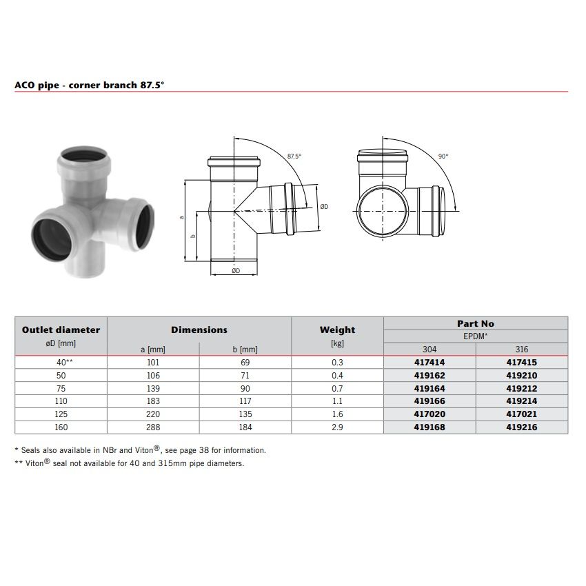ACO Stainless Steel Socketed 87.5 Degree Double Pipe Branch Reduction with EPDM Seal