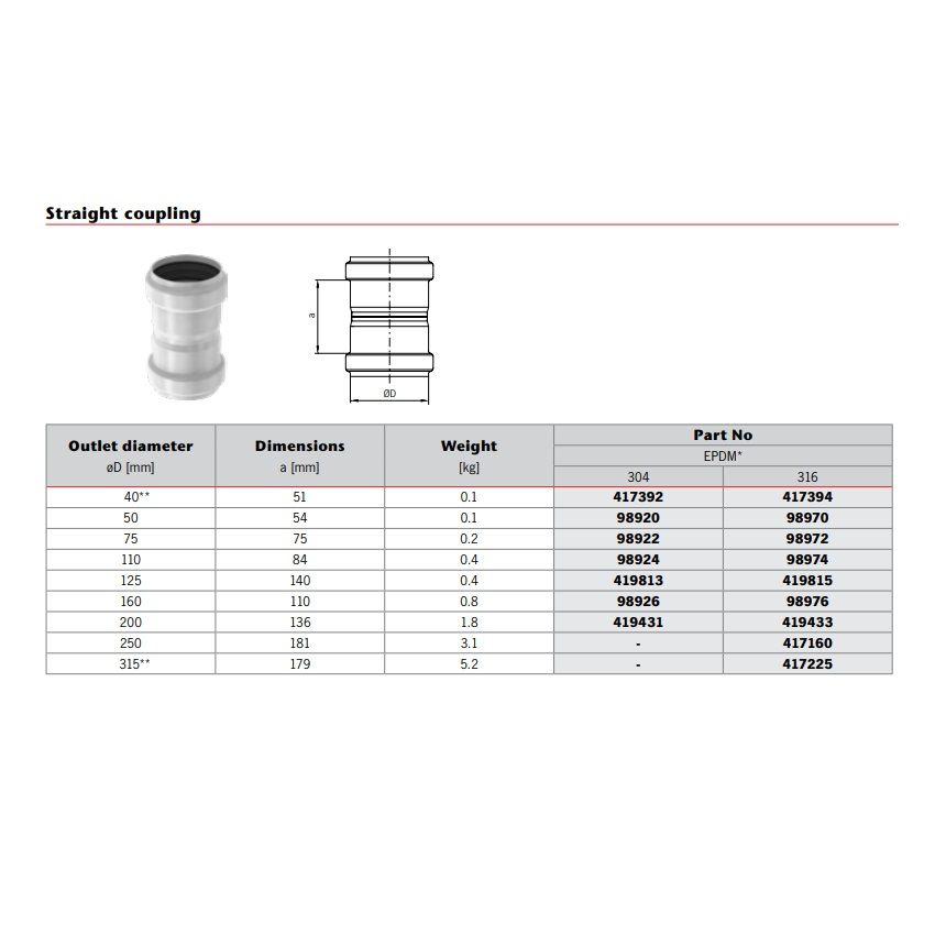 ACO Stainless Steel Socketed Concentric Increaser Coupling with EPDM Seal