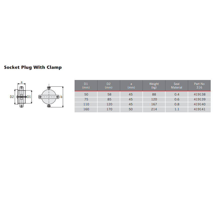 ACO Stainless Steel Socketed Plug With Clamp, available in diameters 50mm, 75mm, 110mm & 160mm.