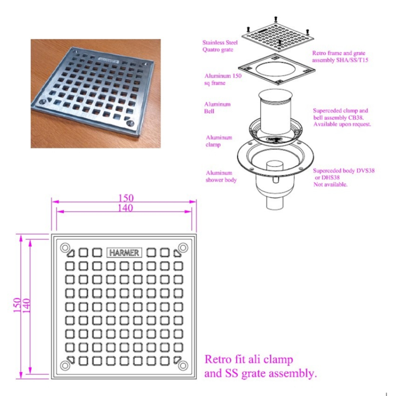 Harmer Shower Retro Fit Aluminium Clamp & Stainless Steel Quatro Grate Assembly for Tiled or Resin Flooring.