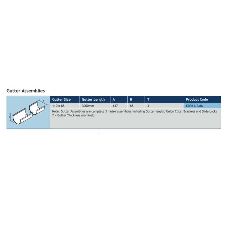 Alumasc Aqualine Deep Run extruded gutters x 3m Length, 110mm x 85mm profile, complete with 1no union clip and 4no fixing brackets. Suitable for commercial applications where a contemporary design is required. Smooth lines are achieved by incorporating a hidden fix bracketry system.