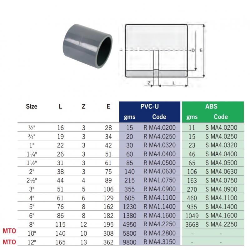 Astore ABS Imperial Pipe Socket Plain, OD ranges from ½"-8", for use in pressurised irrigation systems, drinking water, chemical installations and for water treatment.