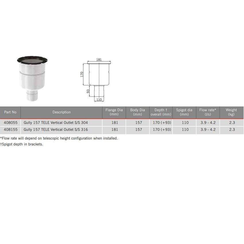 ACO Hygienic Stainless Steel Gully 157 Round Top - Fixed Height Vertical 110mm Outlet Top Size 230