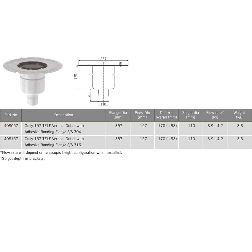 ACO Hygienic Stainless Steel Gully 157 - Telescopic Horizontal 110mm Outlet