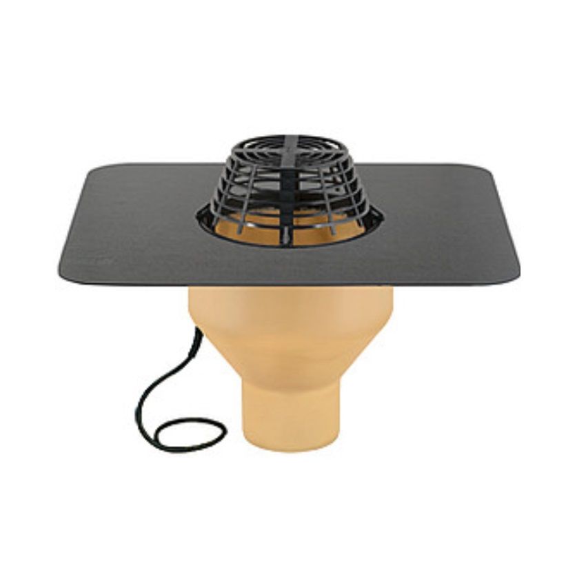 Sita Insulated Vertical Spigot Roof Outlet with self -regulating heating element and 2m long connecting cable for 230 V, approximately 10 W. No transformer required. Complete with Dome gate, to connect to pipe sizes 75mm, 110mm, 125mm, 160mm & 200mm. Includes a choice of Bitumen (Elastomer bitumen) or PVC-Standard (light grey) sleeve. Other sleeves are available on special order.