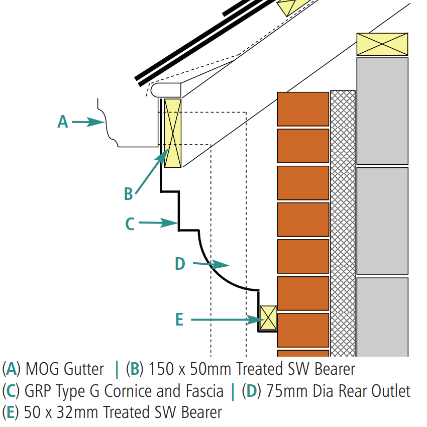 Rainguard GRP Cornice Fascia Profile G, 135 Degree Angle, together with a complete range of fittings and a range of PPC RAL colours to choose from.