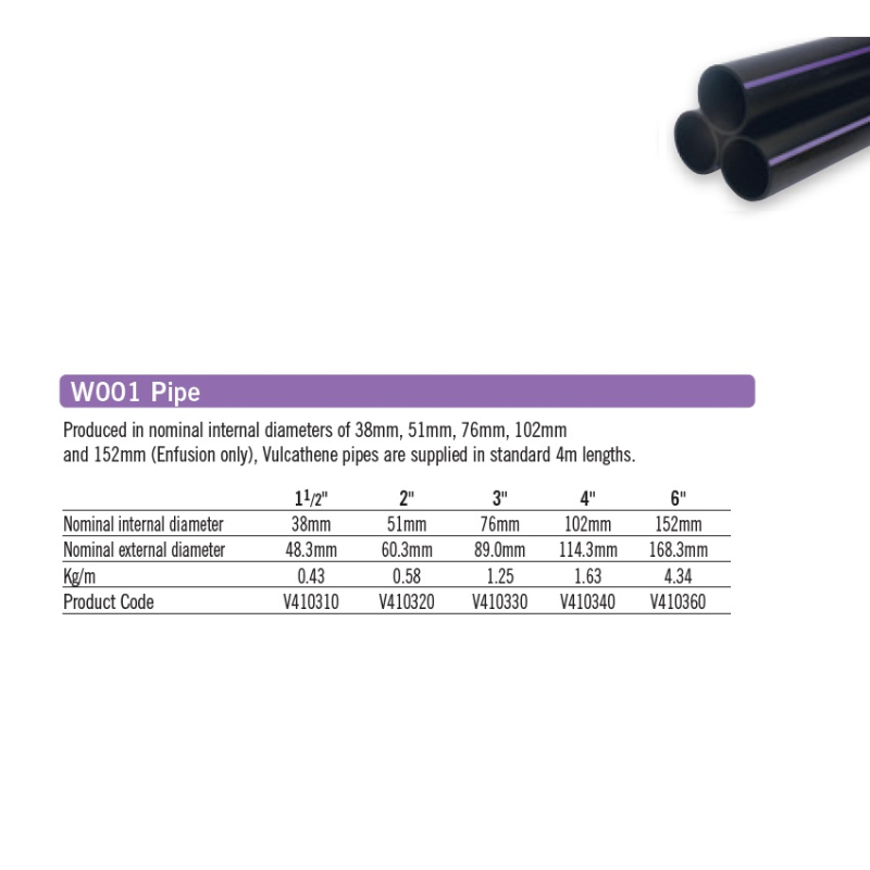 Vulcathene Pipe x 4m length, used for both Mechanical & Enfusion Systems, colour Black, produced in nominal internal diameters of 38mm, 51mm, 76mm, 102mm and 152mm (Enfusion only)
