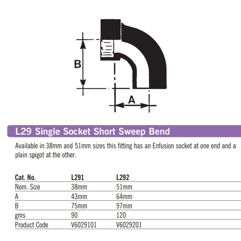 Vulcathene Enfusion Single Socket Short Sweep Bend L29, colour Black, produced in nominal internal diameters of 38mm and 51mm. This fitting has an Enfusion socket at one end and a plain spigot at the other.
