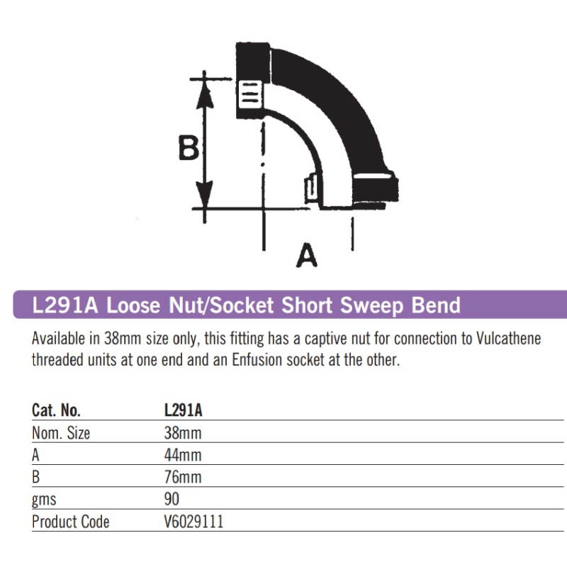 Vulcathene Enfusion Loose Nut/Socket Short Sweep Ben L291A, colour Black, produced in a nominal internal diameter of 38mm. This fitting has a captive nut for connection to Vulcathene threaded units at one end and an Enfusion socket at the other.