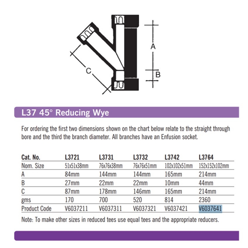 Vulcathene Enfusion 45 Degree Reducing Wye L37, colour Black, produced in nominal internal diameters of 51mm, 76mm, 102mm and 152mm. All branches have an Enfusion socket.