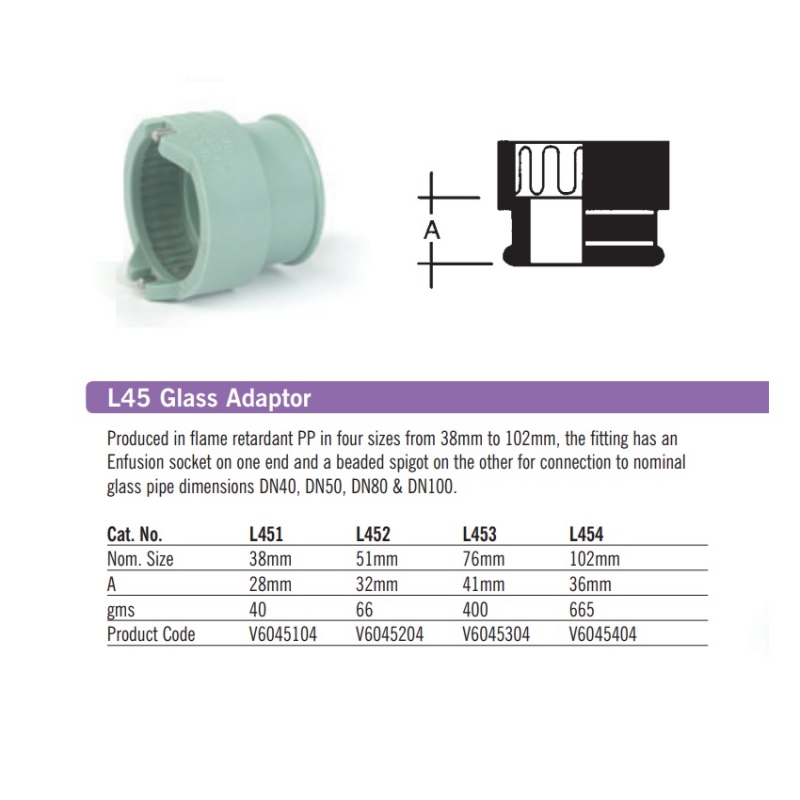 Vulcathene Enfusion Glass Adaptor L45, Colour Black, Made in nominal internal diameters of 38mm, 51mm, 76mm & 102m. Produced in flame retardant PP, the fitting has an Enfusion socket on one end and a beaded spigot on the other for connection to nominal glass pipe dimensions DN40, DN50, DN80 & DN100.