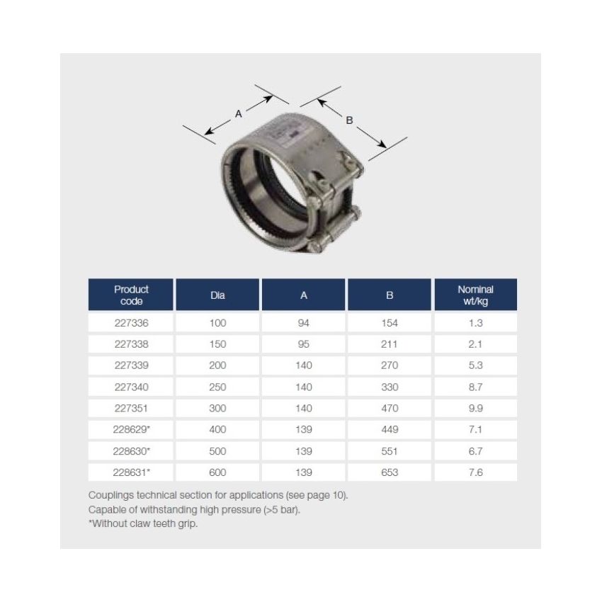 Pam Building Ensign Stainless Steel High Performance Couplings ED002HP, available in 100mm, 150mm, 200mm, 250mm, 300mm, 400mm, 500mm, and 600mm diameter, for Below Ground.