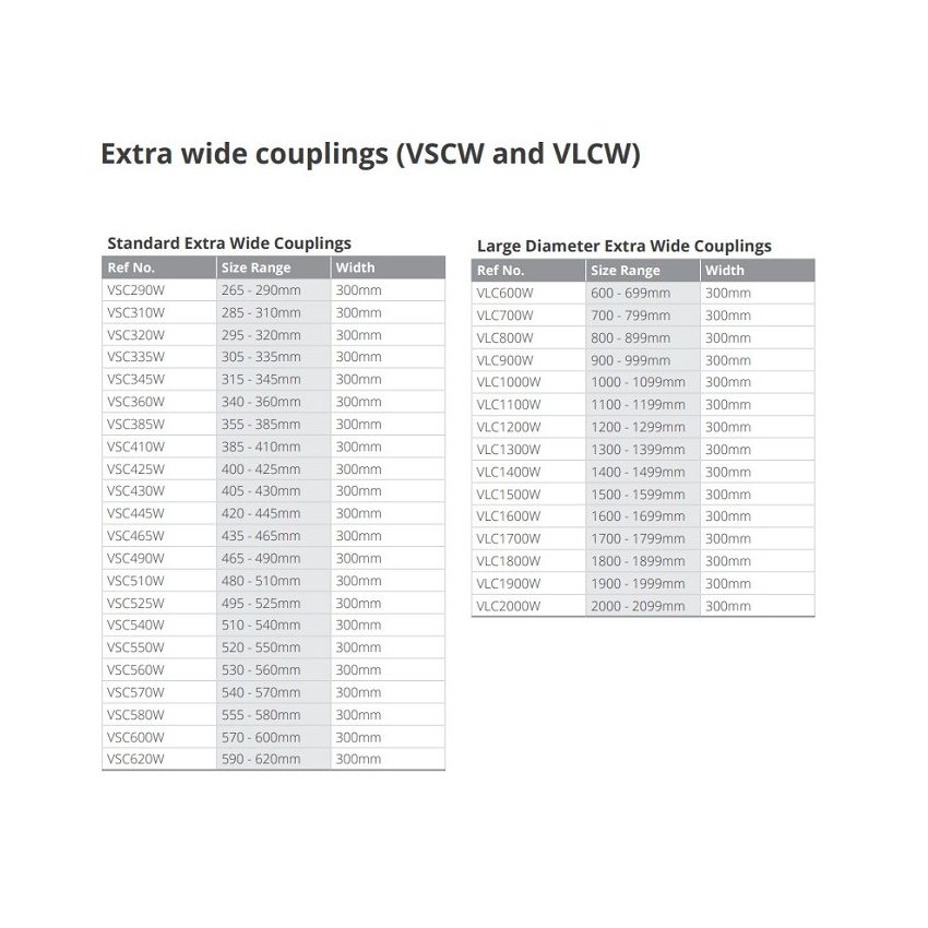 VIPSeal extra wide couplings, 300mm wide, allow for greater tolerance when cutting the pipe ends. Size ranges from 265mm- 2100mm diameter.