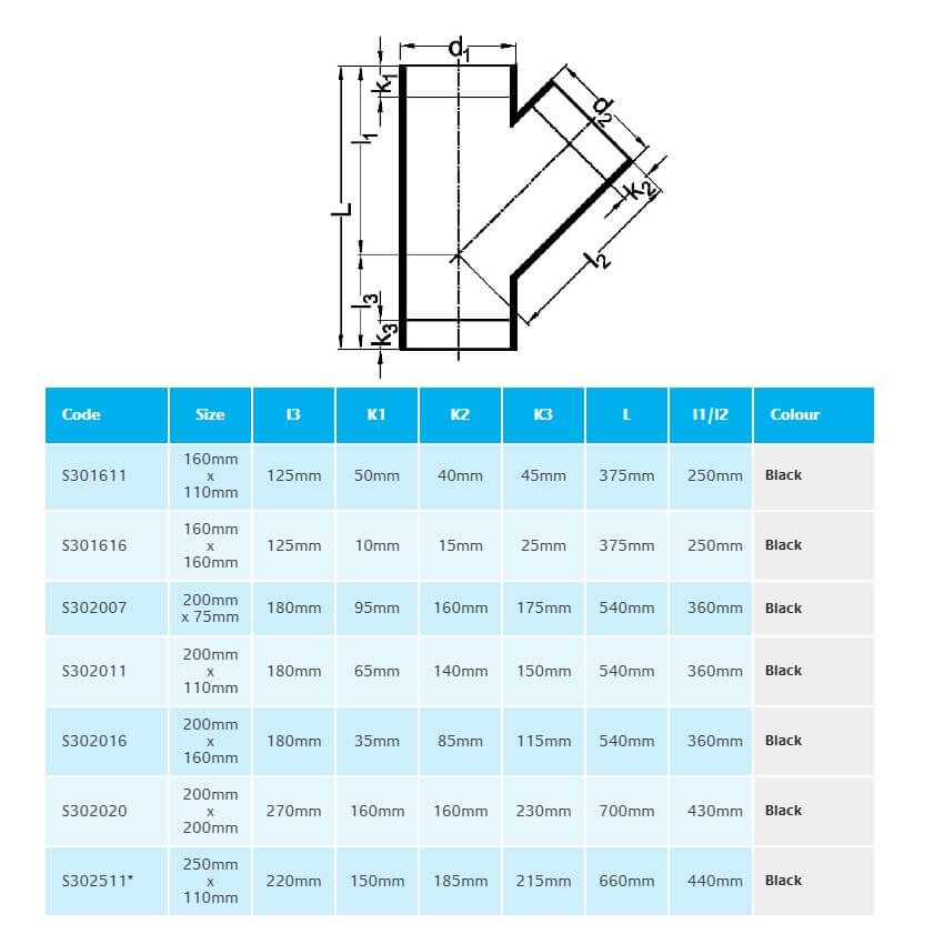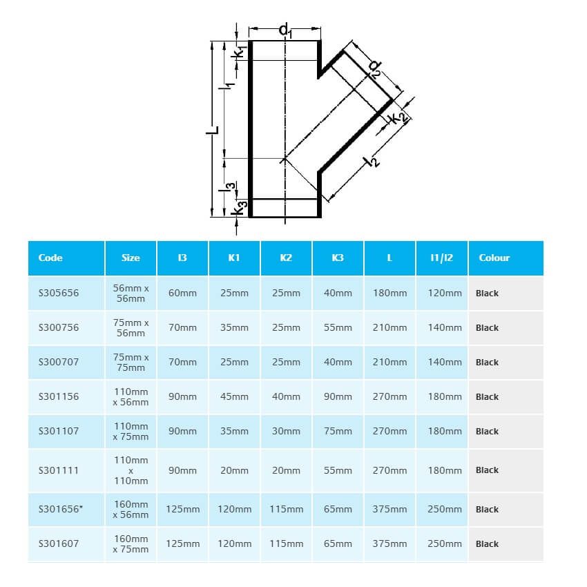 Marley HDPE Plastic 45 Degree Y-Branch, available in size range: 56mm/56mm, 75mm/56mm, 75mm/75mm, 110mm/56mm, 110mm/75mm, 110mm/110mm, 160mm/56mm*, 160mm/75mm, 160mm/110mm, 160mm/160mm, 200mm/75mm, 200mm/110mm, 200mm/160mm, 200mm/200mm, 250mm/110mm*, 250mm/160mm*, 250mm/200mm*, 250mm/250mm*, 315mm/110mm*, 315mm/160mm*, 315mm/200mm*, 315mm/250mm* & 315mm/315mm* (available in black colour only).