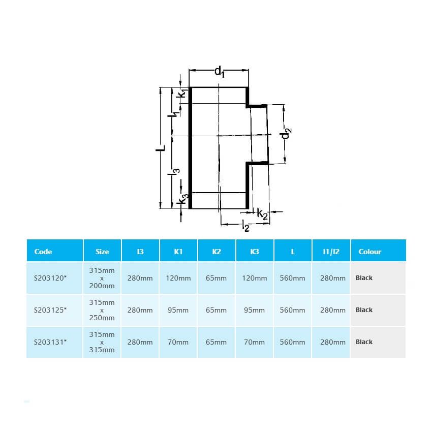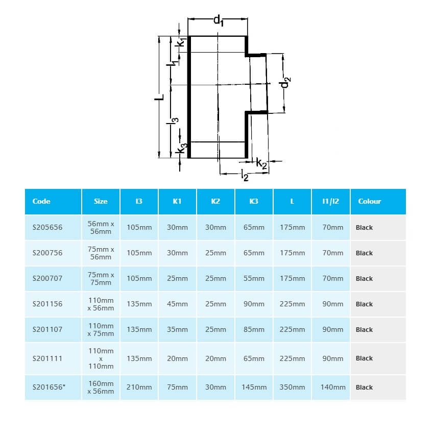 Marley HDPE Plastic 88.5 Degree Branch, available in size range: 56mm/56mm, 75mm/56mm, 75mm/75mm, 110mm/56mm, 110mm/75mm, 110mm/110mm, 160mm/56mm*, 160mm/75mm*, 160mm/110mm*, 160mm/160mm*, 200mm/75mm*, 200mm/110mm*, 200mm/160mm*, 200mm/200mm*, 250mm/110mm*, 250mm/160mm*, 250mm/200mm*, 250mm/250mm*, 315mm/110mm*, 315mm/160mm*, 315mm/200mm*, 315mm/250mm* & 315mm/315mm* (available in black colour only). Equal Branches for Rainwater Applications only.