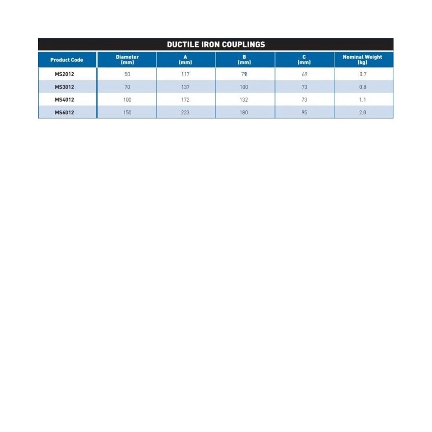 MECH 416 Soil Ductile Iron Couplings, available in 50mm, 70mm, 100mm & 150mm diameter.