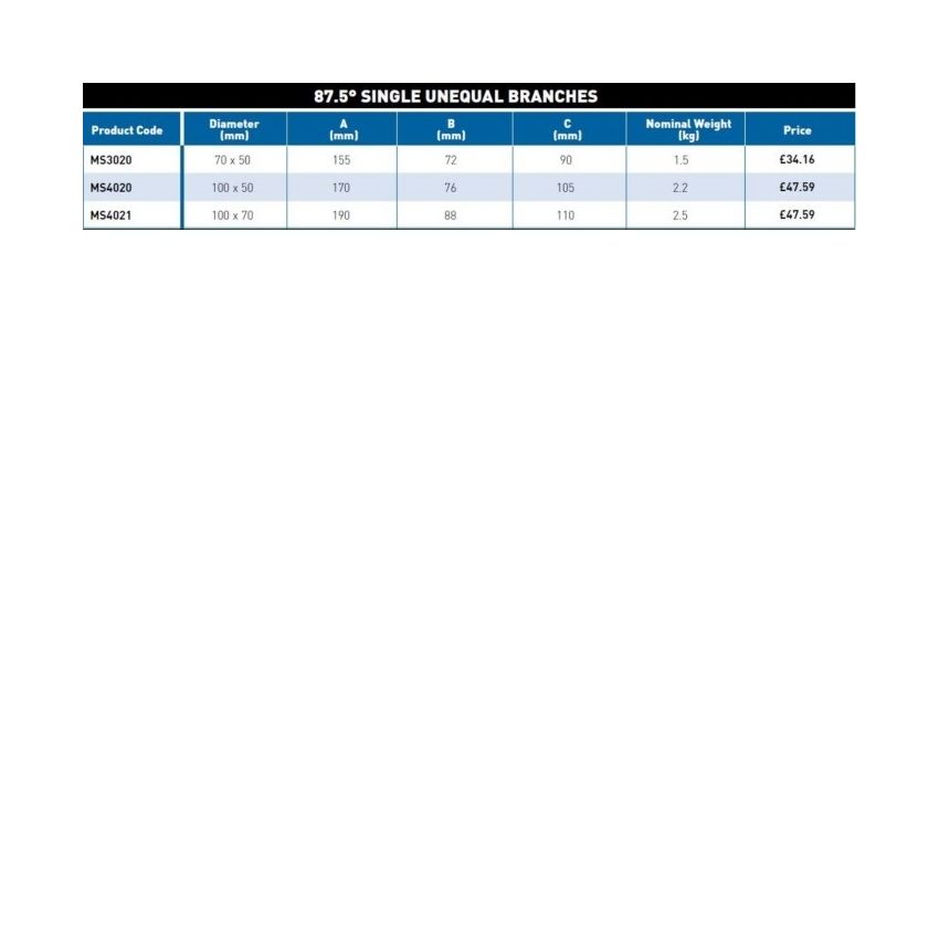 MECH 416 Soil 87.5 Degree single unequal branches, available in 50mm x 70mm, 50mm x 100mm and 70mm x 100mm diameter.