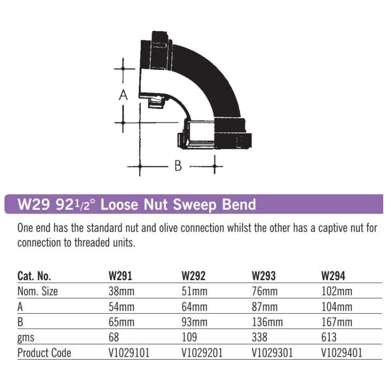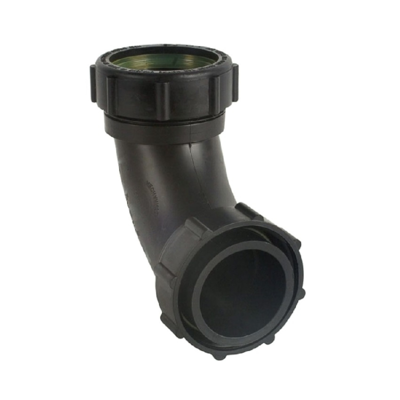 Vulcathene Mechanical 92.5 Degree Loose Nut Sweep Bend W29, Colour Black, Made in nominal internal diameters of 38mm, 51mm, 76mm and 102mm. One end has a standard nut and olive connection whilst the other has a captive nut for connection to threaded units.