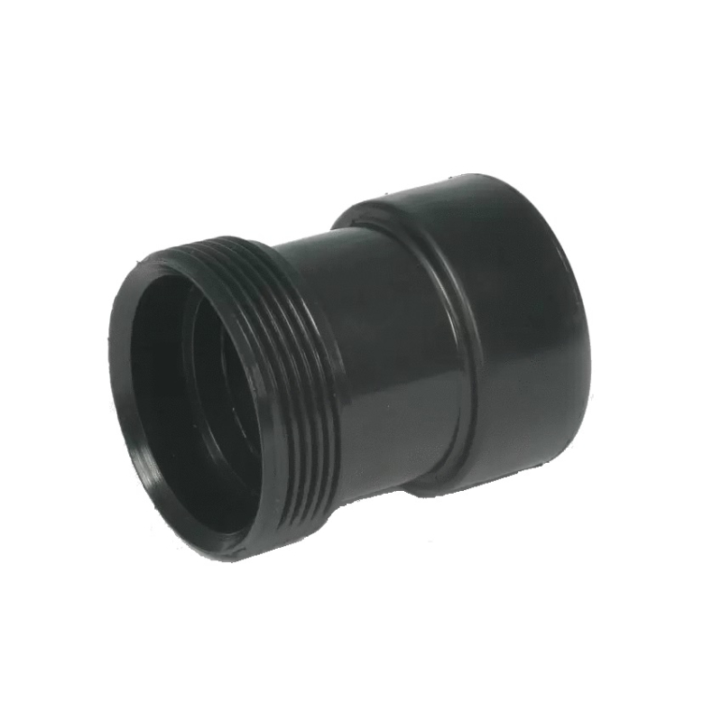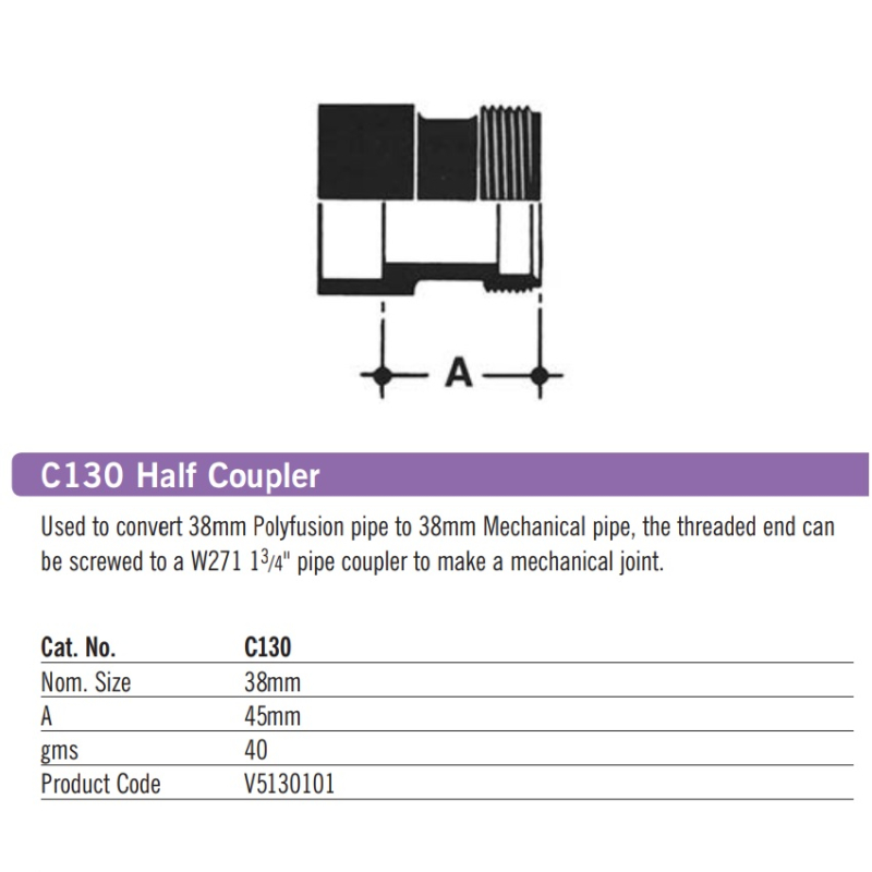 Vulcathene Half Coupler C130. Made in a nominal internal diameter of 38mm. Used to convert 38mm Polyfusion pipe to 38mm Mechanical pipe, the threaded end can be screwed to a W27 1.75" pipe coupler to make a mechanical joint.