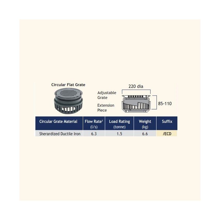 Harmer Cast Iron Medium Sump Vertical Spigot Outlet 220mm Circular Ductile Iron Adjustable, available with a Flat grate in sizes 50mm, 75mm & 100mm. Inherently strong, cast iron is an ideal choice for load-bearing applications.