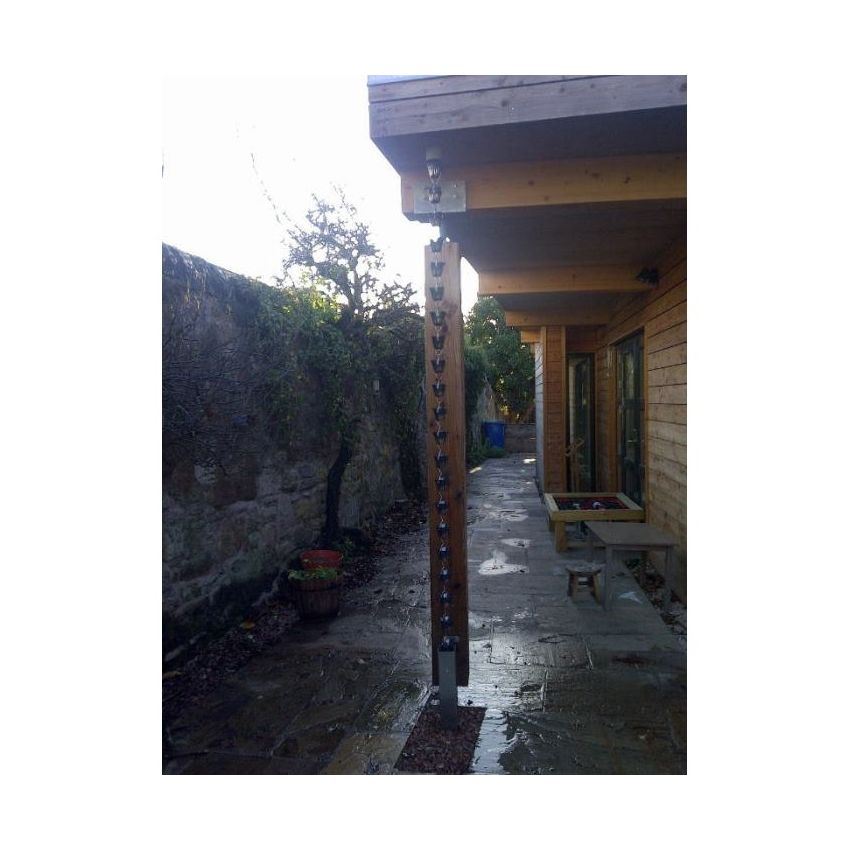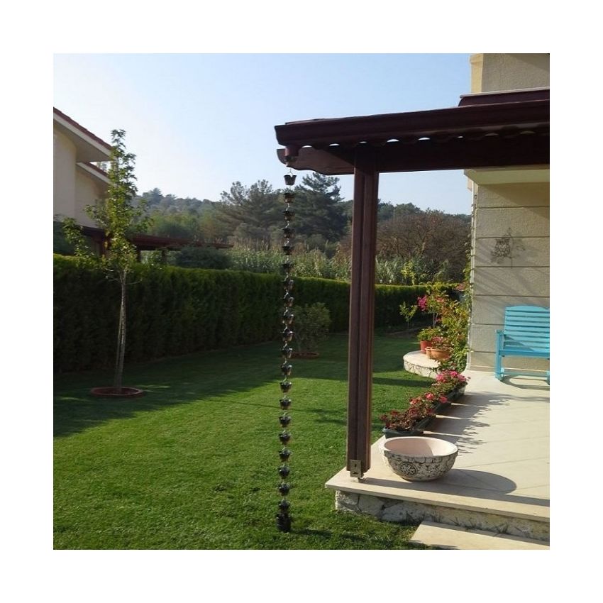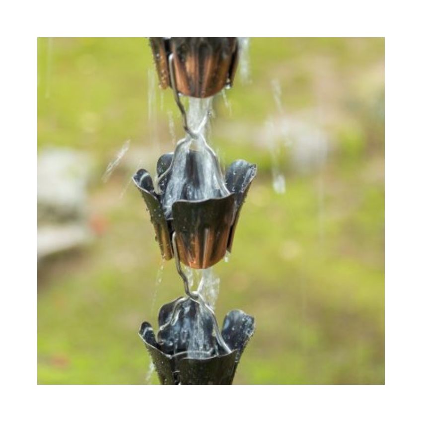 Migumo Rain Chain made from copper & stainless steel. A rain chain specifically designed for Japanese houses. Created on the motif of a flower opening to the sky made by joining three parts, the flower petals being made from copper.
