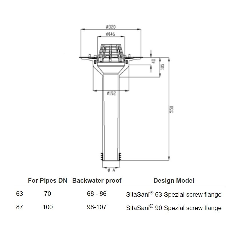 Sita Sani Refurbishment Vertical Screw-on Flange Roof Outlet, complete with Dome gate, length 550mm, in twp sizes 63 and 90, suitable with internal diameters between 68 - 86mm and 98 - 107mm.