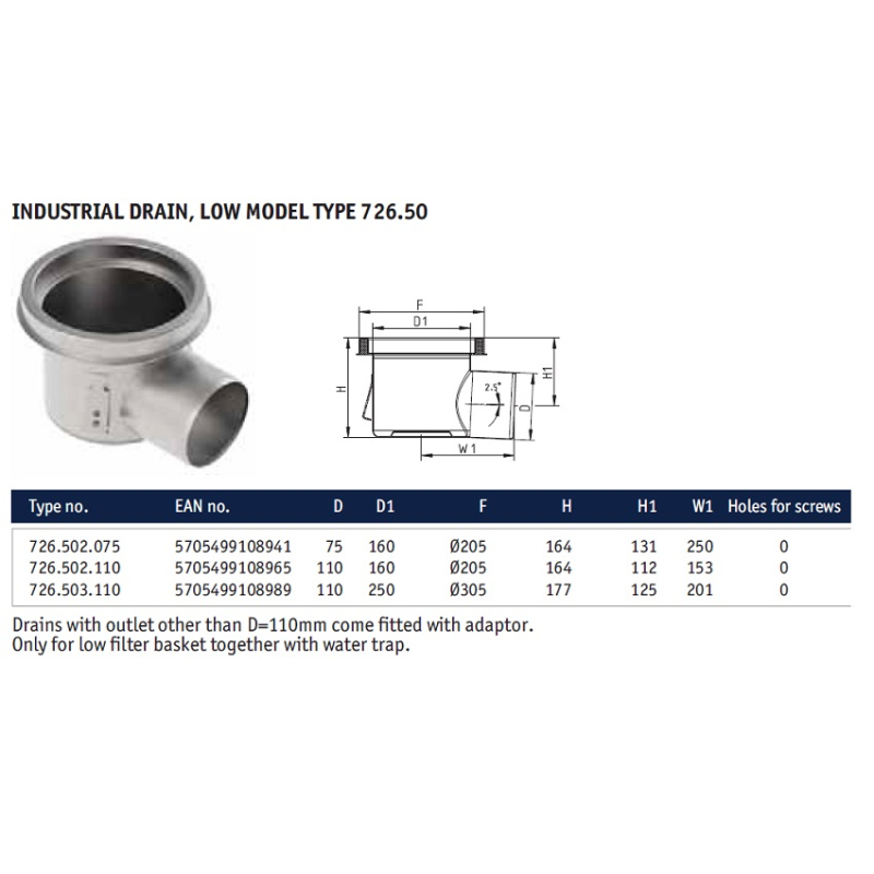 Blucher Stainless Steel Industrial Horizontal Low Model Type Drain Fixed Height for Vinyl Floors, 75mm & 110mm Connection, Frame Size 205mm or 305mm. All gratings sold separately.*