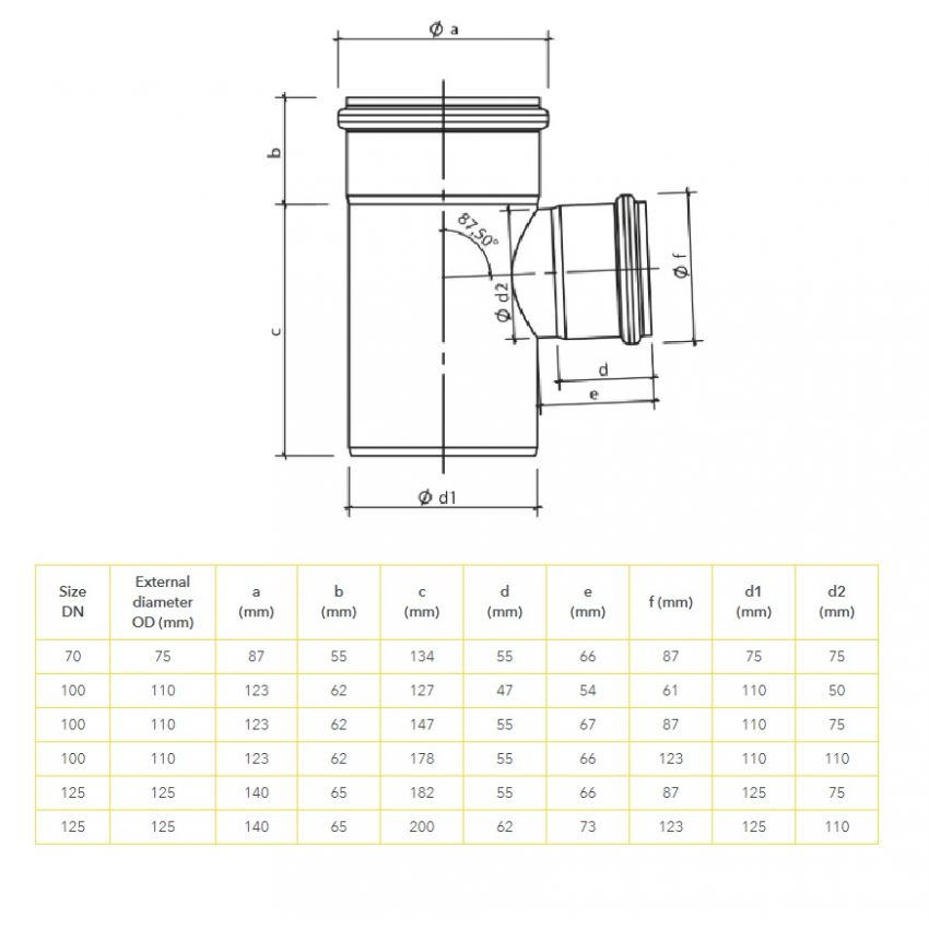 Sita Attika Stainless Steel Stainless Steel 87.5 Degree Branch, with a seal made of EPDM mounted in the socket at the factory, pipe sizes, 75mm, 110mm & 125mm