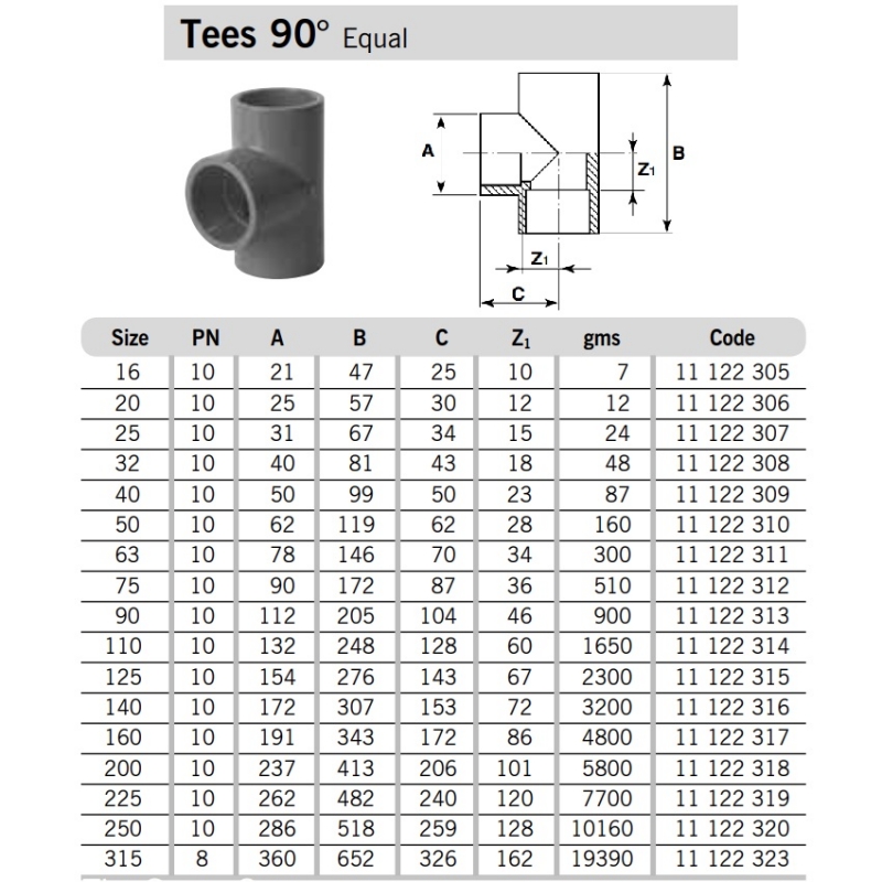 SuperFLO ABS Metric Pipe 90 Degree Equal Tee, OD ranges from 16-315mm, for low temperature fluid transportation.