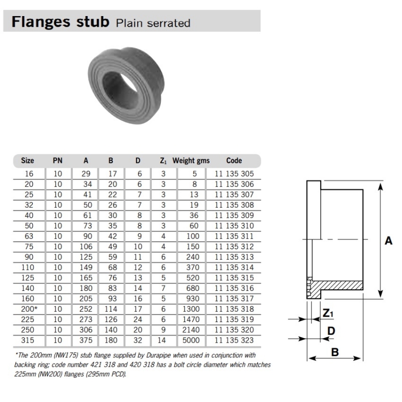 SuperFLO ABS Metric Pipe Flanges Stub, OD ranges from 16-315mm, for low temperature fluid transportation. Plain Serrated.