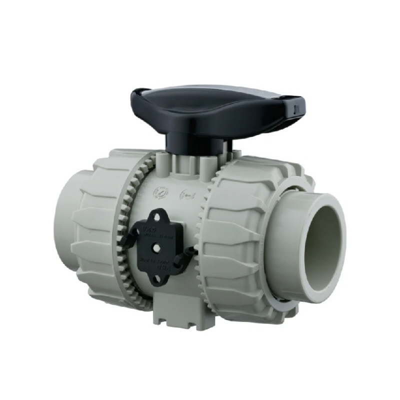 SuperFLO ABS Metric VKD Pipe Double Union Ball Valve, OD ranges from 16-110mm, for low temperature fluid transportation. Manuel - EPDM seals.