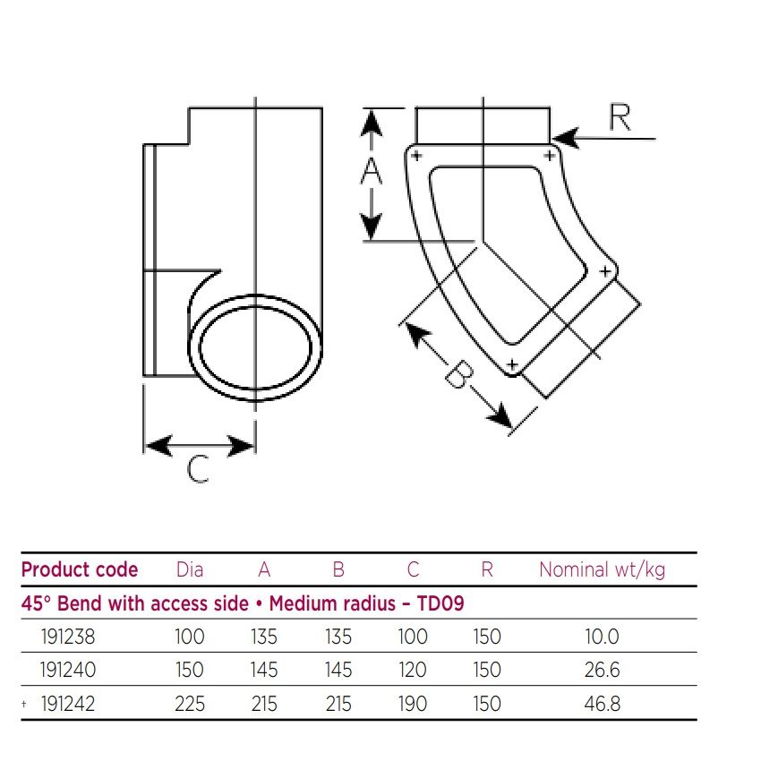 Pam Building Cast Iron 45 Degree Medium Radius Bend with Side Access, available in 100mm, 150mm & 225mm diameter, for Below Ground.