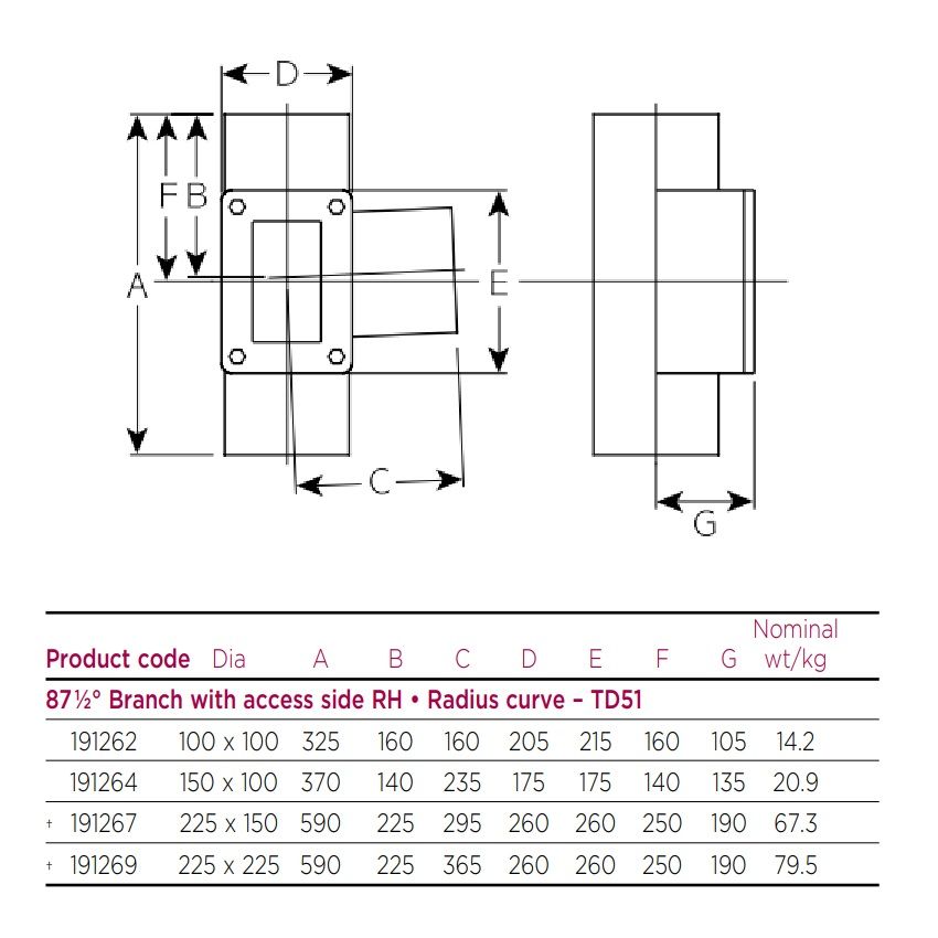 Pam Building Cast Iron 87.5 Degree Single Branch with Right Hand Access Door, available in 100mm x 100mm, 150mm x 100mm, 225mm x 150mm & 225mm x 225mm diameter, for Below Ground.
