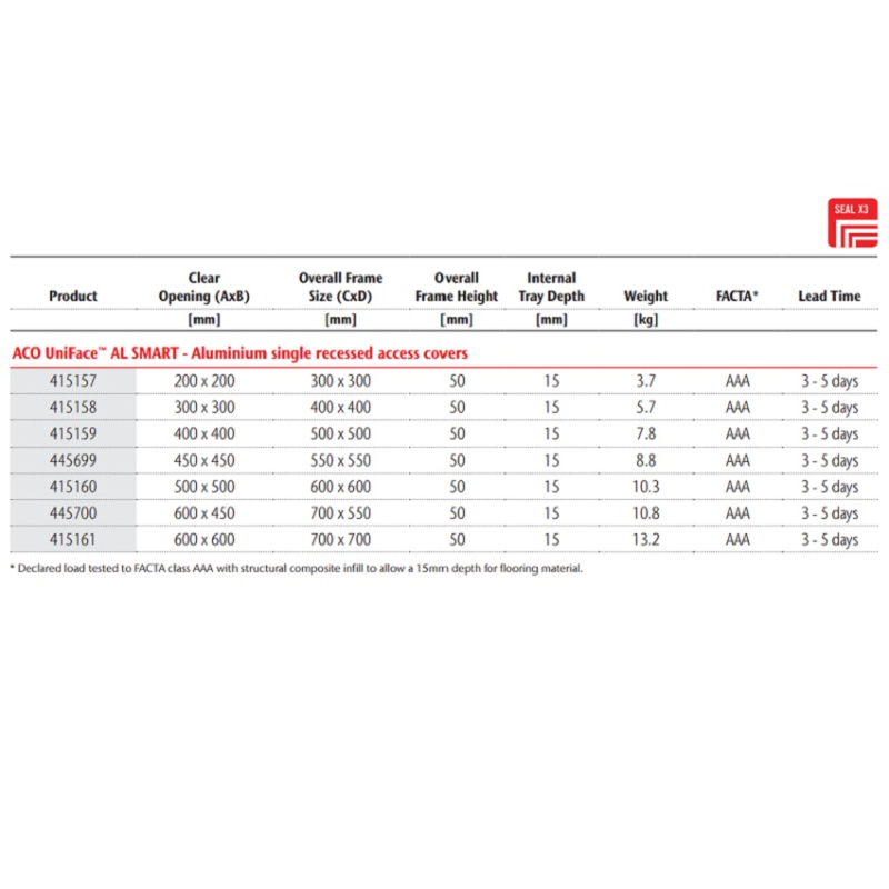 ACO UniFace Aluminium Smart Recessed Access Cover Class AAA (Up to 10 tonnes) for openings between 200 and 600mm. All prices include 1no set of lifting & locking key set, plus screws & dust cap set.