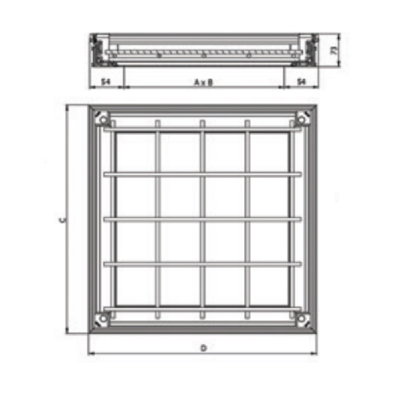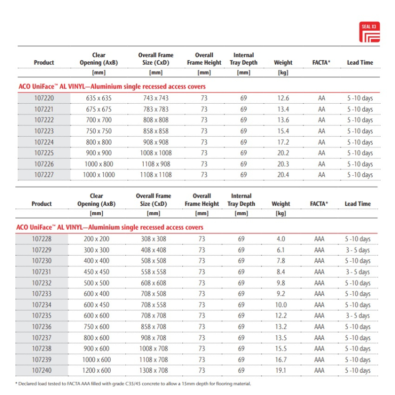 ACO UniFaceTM AL VINYL range of aluminium recessed covers designed for 2-4mm thick flexible vinyl floor finishes where a durable welded sealed joint is required. Integral weldable PVC trim fitted to the cover and frame ensures vinyl floor installation is quick and simple. With a frame depth of 73mm its ideal for pedestrian , trolley and light duty vehicle traffic. Wide range of size options available for clear openings of between mm and 1200mm. All covers fitted with EPDM liquid, odour and dust seals as standard with four point stainless steel locking.