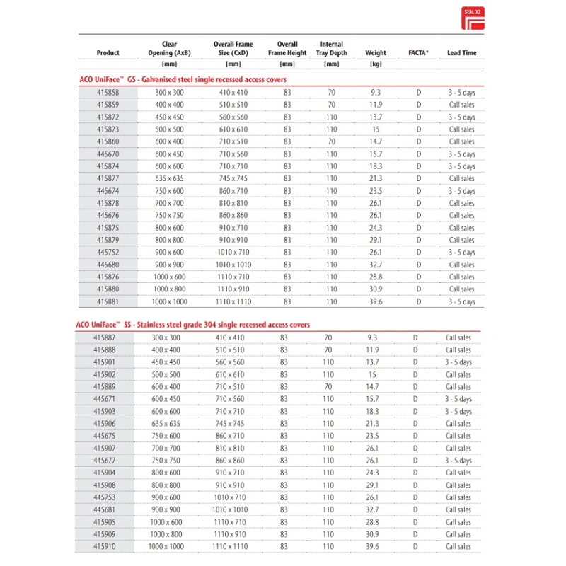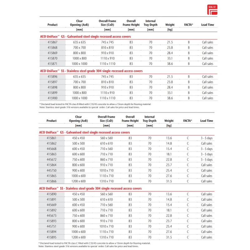 ACO UniFace Recessed Galvanised or Stainless Steel Access Cover for openings between 300 and 1200mm. All prices include 1no set of lifting & locking key set, plus screws & dust cap set.