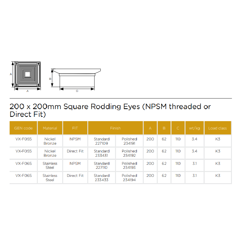Pam BuildingVortX 200mm Square Rodding Eyes, available in Stainless Steel for direct fix or NPSM Threaded.