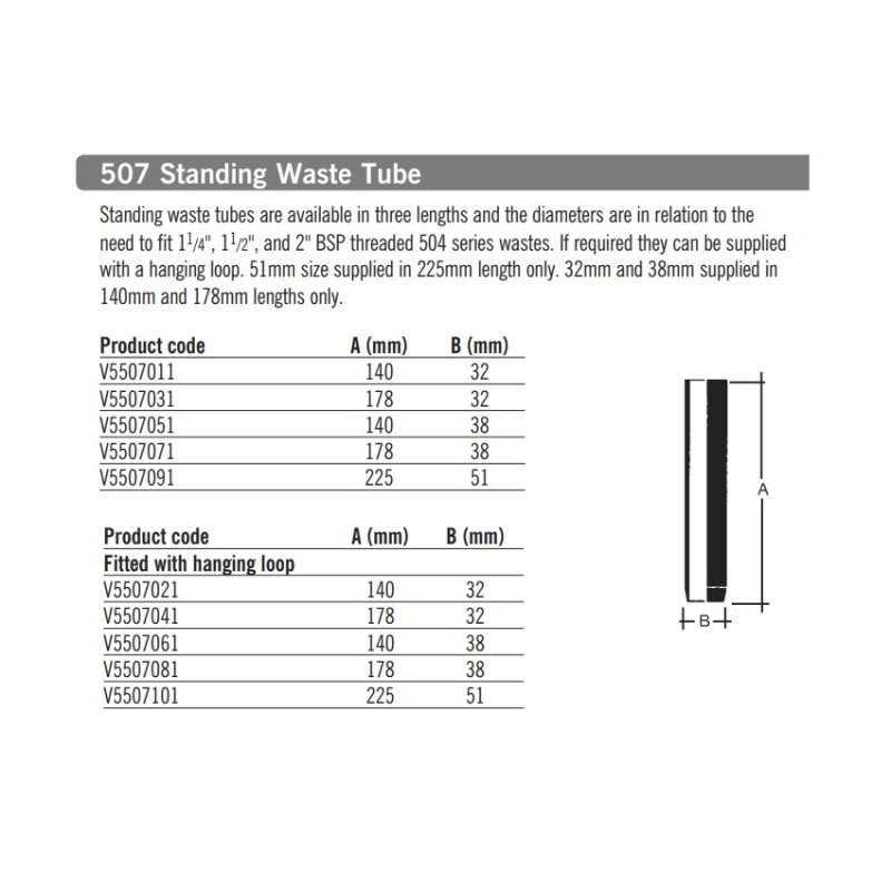 Vulcathene Standing Waste Tube with Hanging Loop 507, Colour Black, available in Three lengths, to fit BSP Threaded Sizes, 1¼", 1½", and 2".