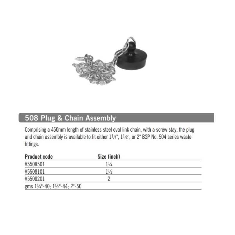 Vulcathene Plug & Chain Assembly 509, Supplied With 450mm Stainless Steel Chain, To Fit 1¼", 1½", and 2" BSP for 504 Series Waste Fittings.