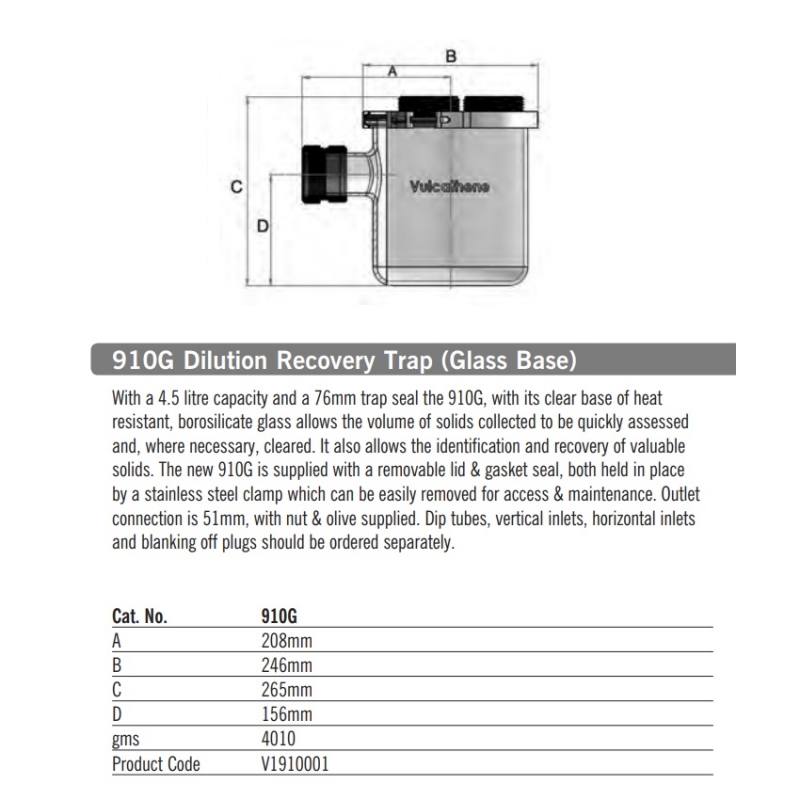 Vulcathene Dilution Recovery Trap (Glass Base) 910G, with a 4.5 litre capacity and a 76mm trap seal, used under-bench height where access is limited.