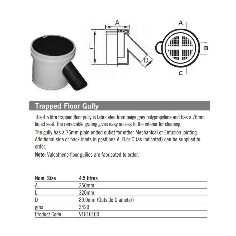 Vulcathene Trapped Floor Gully, with a 4.5 litre capacity, fabricated from beige grey polypropylene, incorporating a 76mm liquid seal.